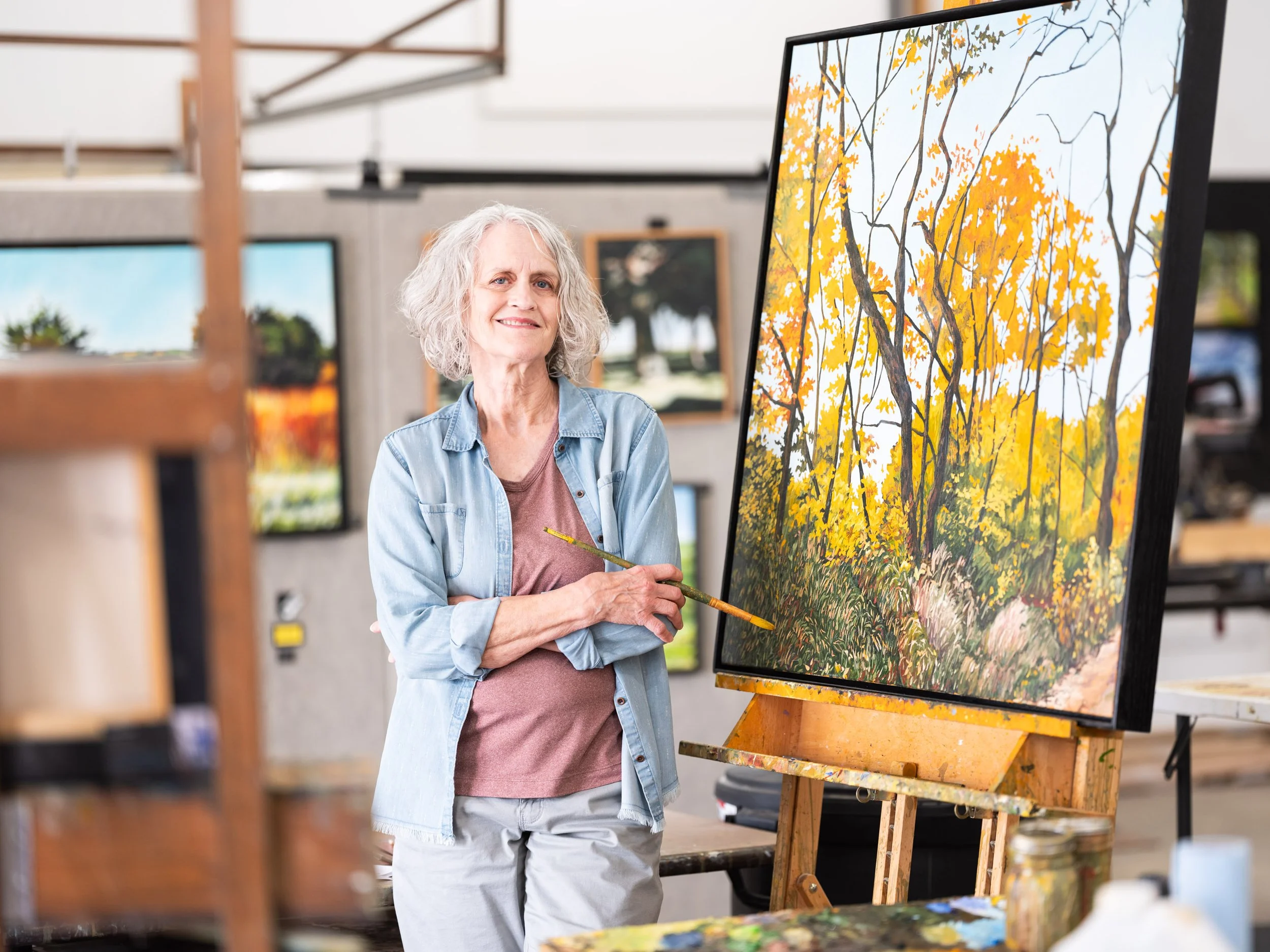 Much like the Impressionists, my paintings are an attempt to capture a specific movement, an experience. An attempt to convey the excitement I experience from the view at the top of a hill or around the next curve in the road.”Cherie Courter was born in north central Iowa and spent much of her childhood on her grandparents’ farm involved in such traditional tasks as walking beans, bailing hay, feeding livestock, etc. Consequently, her paintings demonstrate a fascination with the Midwestern landscape, incorporating winding gravel roads, tall grasses, seemingly endless fields of crops, big sky and clouds, and bodies of water into bright, colorful, energetic oil paintings.A graduate of Buena Vista University for both undergraduate (BA) and graduate degrees (MS), Ms. Courter was an art educator in the Iowa public school system for thirty years and was also an adjunct professor of art at Buena Vista University and Iowa Central Community College. A working artist and art educator during her teaching career, retirement has allowed Cherie to focus entirely on the further development of her paintings depicting subtleties of color, texture, light, and pattern as well as the many differing landforms present within the Midwest.Ms. Courter’s past works have won numerous honors and awards, including Judge’s Choice Award at the Wanda J. Skogerboe Juried Exhibition, Pearson Lakes Arts Center, and the featured painting on the exhibition banner for the Artisan Road Trip Exhibition at the Pearson Lakes Art Center. Her paintings have been shown throughout the Midwest and many of Ms. Courter’s works are included in public and private collections in Iowa and neighboring states.